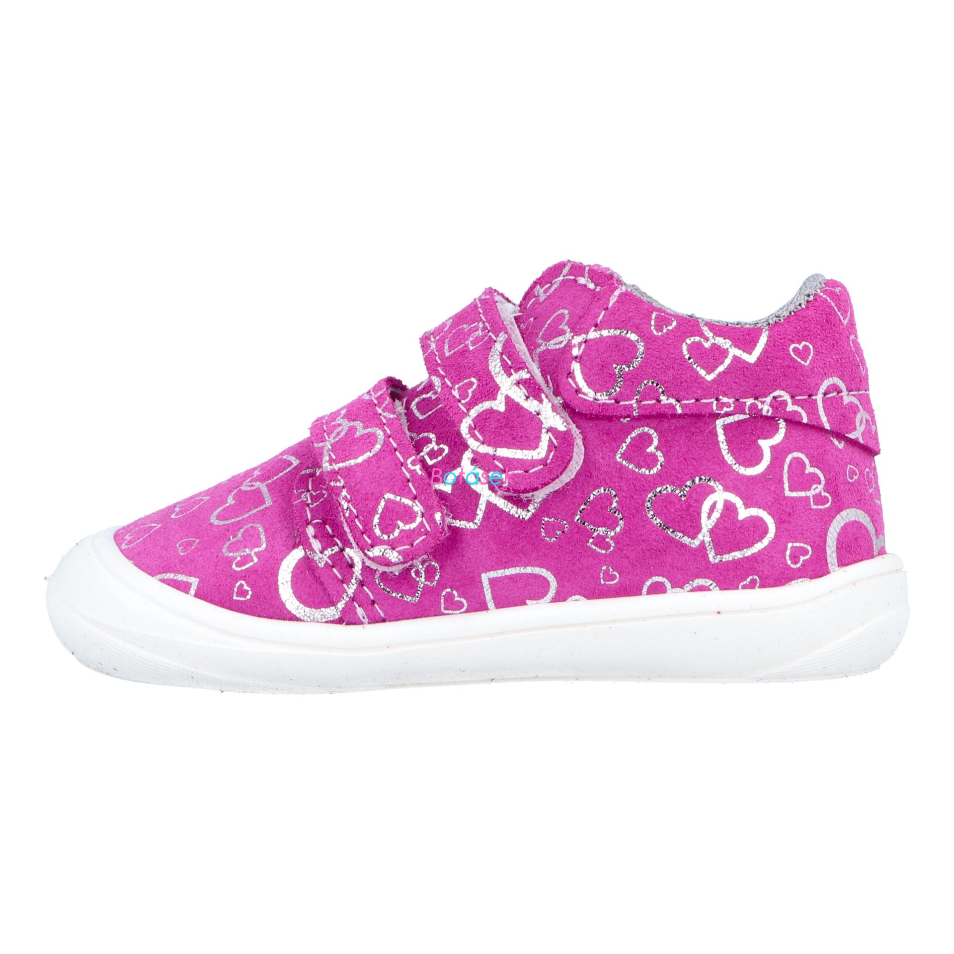 Dětská obuv určená na první krůčky. Obuv je vyrobena z ozdobné kůže s textilní podšívkou na flexibilní podešvi.