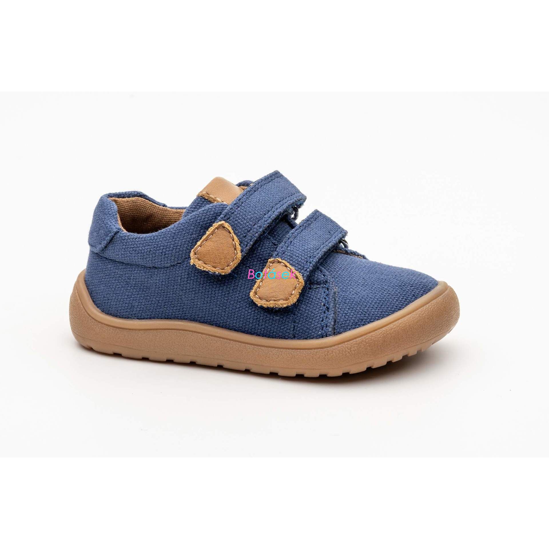 Chlapecké barefoot tenisky jsou vyrobeny z textilu v modré barvě. Dva suché zipy pevně fixují botu na noze. Uvnitř mají netvarovanou, vyjímatelnou stélku. Kulatá podešev má jemný protiskluzový dezén, je odolná, ale velmi ohebná. Špička je dostatečně prostorná pro širší chodidlo. Rovná podešev má nulový podpatek, který zajistí chůzi „jako naboso“. Částečně zpevněný podpatek udržuje nožku ve správném postavení.