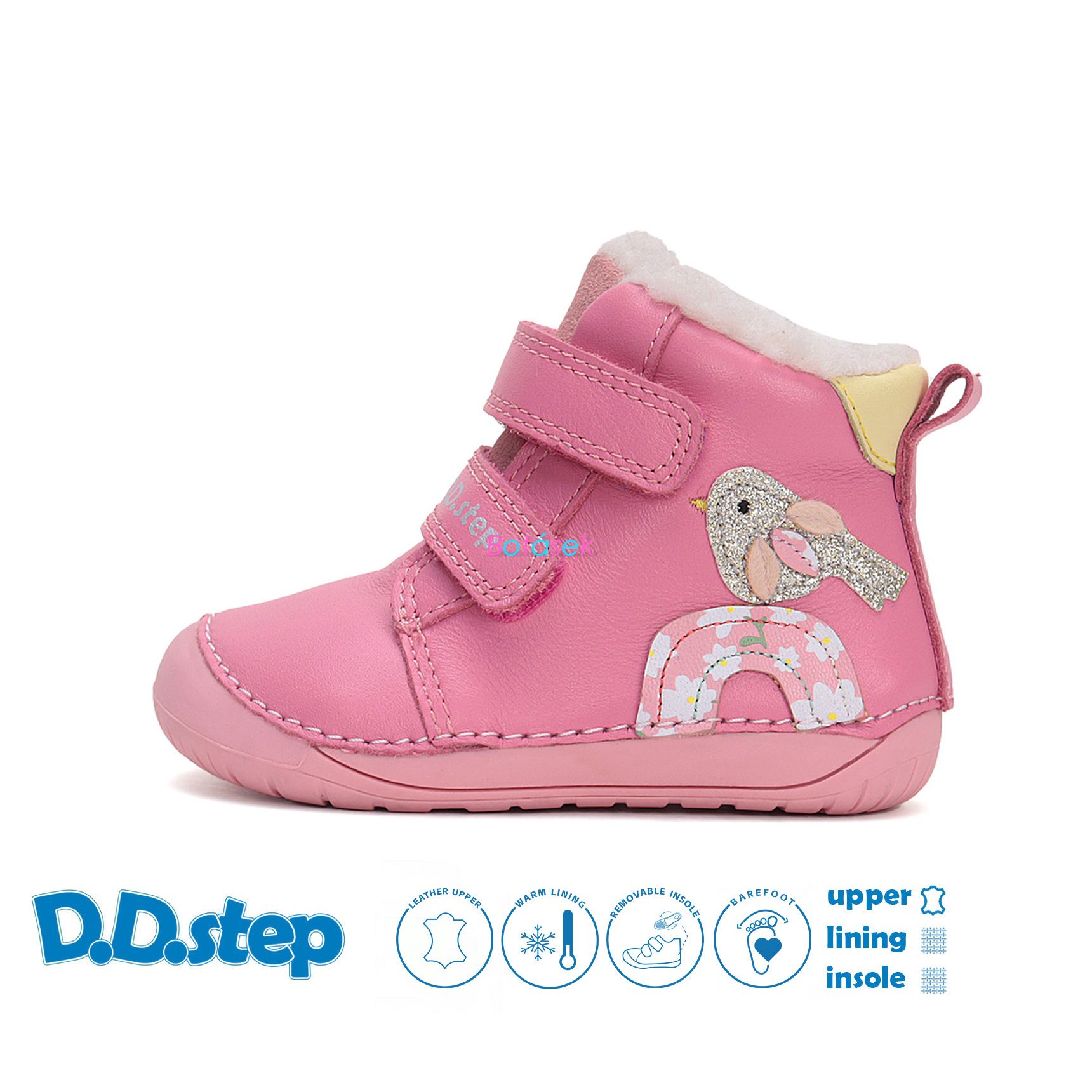 Zimní dětské kožené zateplené boty. Botičky mají maximálně ohebnou podešev. Přední část má kulatou a prostornou špičku s dostatkem prostoru pro prsty. Vnitřní část boty je zateplena kožíškem, stélka je také zateplená a vyndávací.